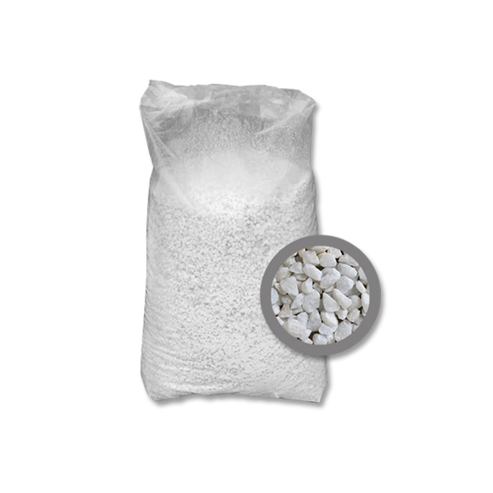 Prirodni drobljeni kamen, bijele boje, granulacije od 4 mm do 7 mm. Namijenjen za uređenje grobova, okućnica i vrtova. Pakiranje 25 kg